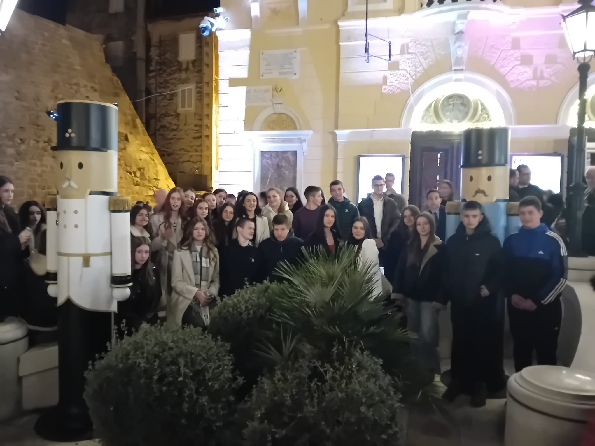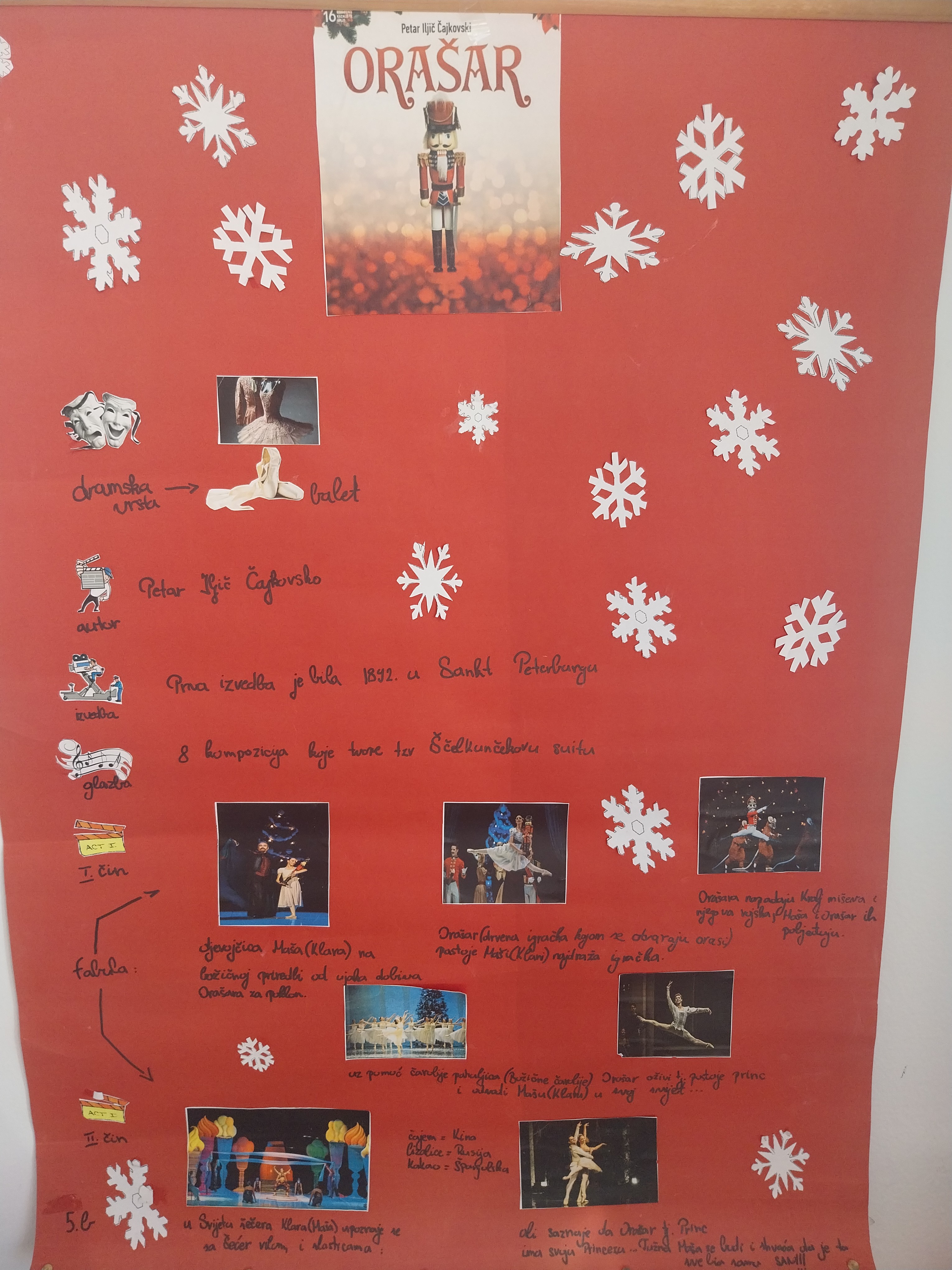 Dana 5. prosinca učenici sedmih i osmih razreda posjetili su HKN Split. I ove godine s oduševljem su odgledali balet Orašar. Prije odlasaka u kazalište učenici su na satovima hrvatskoga jezika i glazbene kulture ponovili pojmove: uvertira, glazbeno-scensko djelo, dramski prvak, scenograf, prizor, ali i tko/što je zapravo orašar. Nakon odgledanog baleta uslijedilo je pisanje komenatara, osvrta, problemskog članka, a izrađen je i plakat kojim je predstavljena fabula i pojmovi povezani s baletom. Učenike su pratili učitelji hrvatskog jezika Nikolina Gaurina i Dino Fabjančić, glazbene kulture Žana Sunara, engleskog jezika Mirela Pletikosić, matematike Martina Kečkemet Radišić i Sandra Matko te učitelji prirodoslovlja Tina Budimir i Marko Vučemilo.